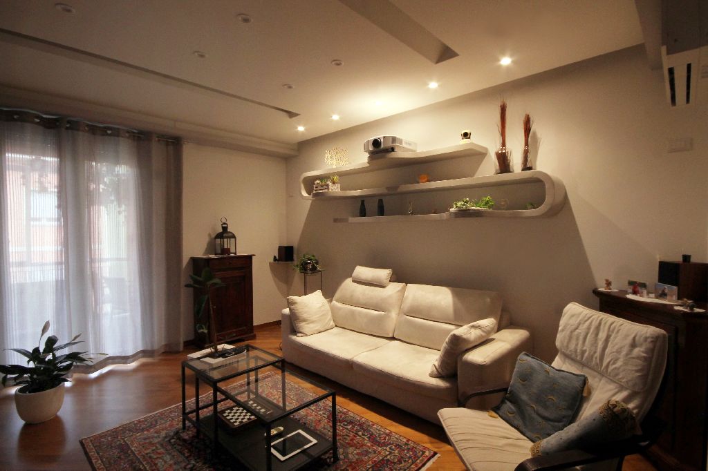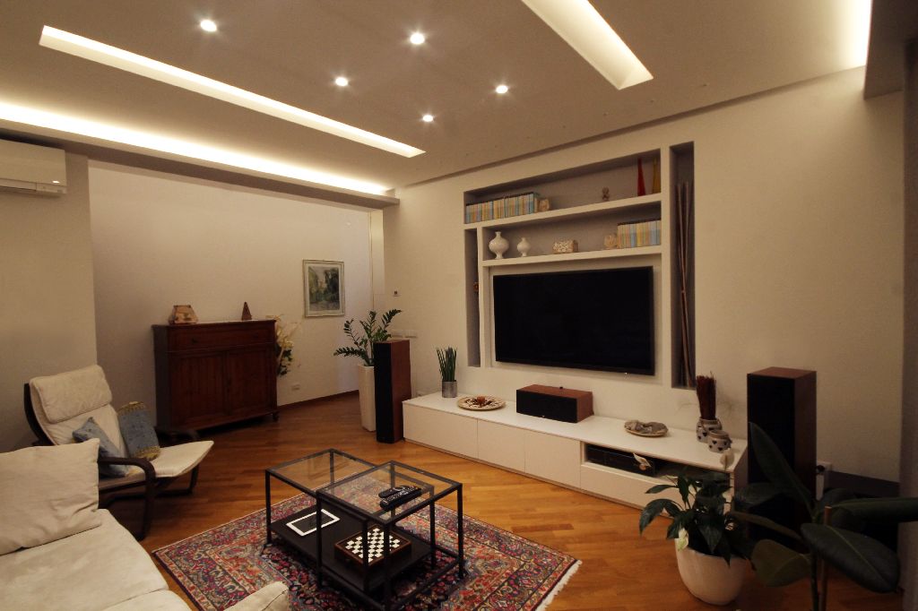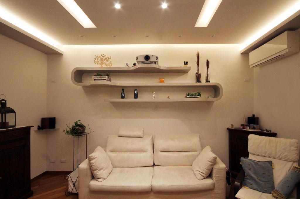 La volontà della committenza di avere una zona living che potesse accogliere la proiezione di film, ha permesso l'analisi e la progettazione di una parete attrezzata che ospitasse la televisione, ma anche un schermo proiettore da utilizzare all'occorrenza. Il controsoffitto in cartongesso permette l'inserimento di cinque diverse modalità di illuminazione, dalla striscia led al faretto ad incasso, per avere combinazioni di luce adatte ad ogni occasione. Il design dei ripiani è stato studiato appositamente per il posizionamento del proiettore, ma l'arredo è utilizzabile come libreria o scaffale ad uso quotidiano.